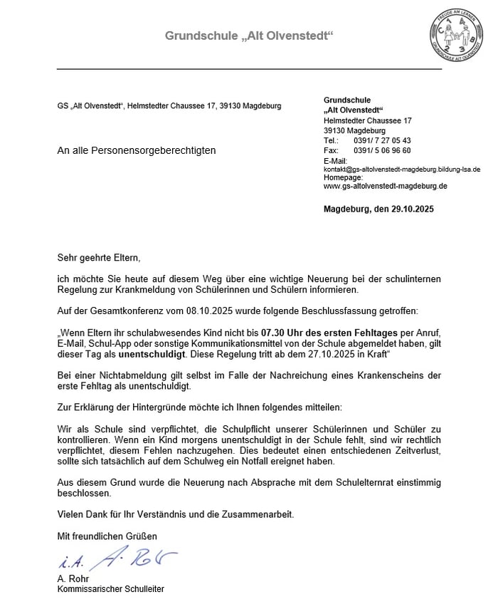 Liebe Eltern der Grundschule "Alt Olvenstedt",